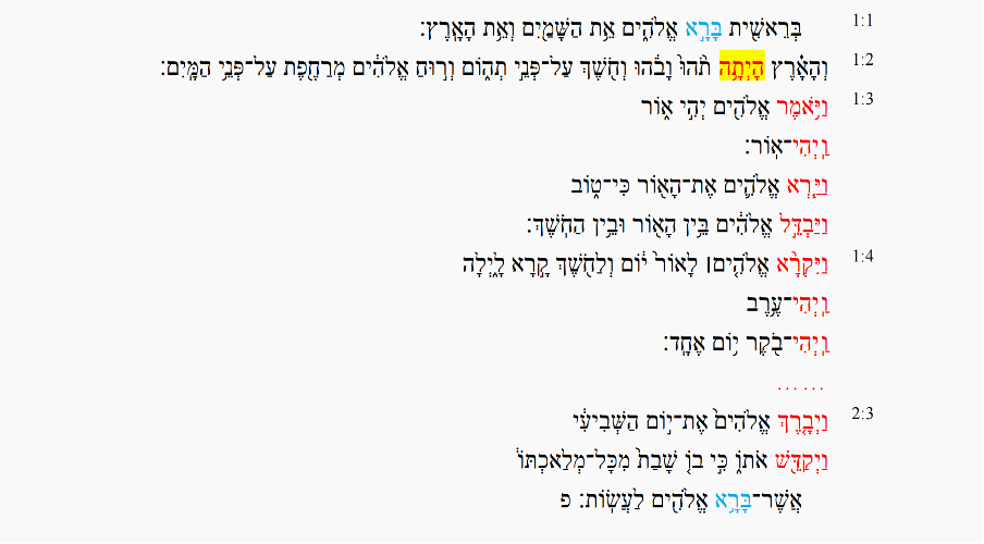 除了语法允许、句法可行,从圣经希伯来叙事的联动序列(WYQTL)的结构层面来看,将ברא读为分词也显得更合理。[13] 如果将1节的ברא读作第一个动词,2节中不带反转连词的完成态系动词היתה就隔开ברא与3节以后WYQTL序列的链接,削弱了叙事的连贯性。读作动词的“创造”,反而无法作为头羊,领起关于创造的一系列主动词。如果将היתה作为第一个动词,它就引导了接下来的WYQTL 序列。并且通览全单元,ברא以分词(创1:1)和从句动词(创2:3)的形式形成inclusio,提供第一版创世叙事的首尾标志,辅助听众记忆。[14]